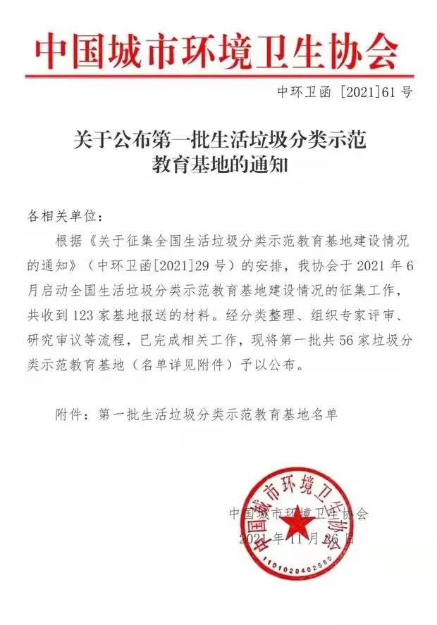 據(jù)悉,中國(guó)城市環(huán)境衛(wèi)生協(xié)會(huì)于2021年6月啟動(dòng)全國(guó)生活垃圾分類示范教育基地建設(shè)情況的征集工作,共有123家基地參選。經(jīng)分類整理、組織專家評(píng)審、研究審議等流程,56家垃圾分類示范教育基地被評(píng)為全國(guó)首批生活垃圾分類示范教育基地。
