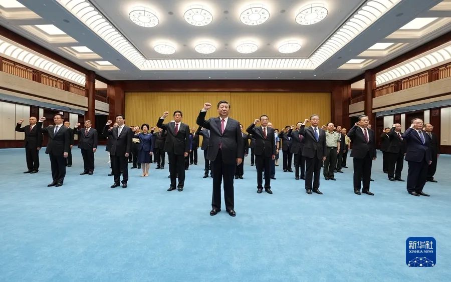2021年6月18日,黨和國家領(lǐng)導(dǎo)人習(xí)近平、李克強、栗戰(zhàn)書、汪洋、王滬寧、趙樂際、韓正、王岐山等在中國共產(chǎn)黨歷史展覽館參觀“‘不忘初心、牢記使命’中國共產(chǎn)黨歷史展覽”。這是參觀結(jié)束后,習(xí)近平帶領(lǐng)黨員領(lǐng)導(dǎo)同志一起重溫入黨誓詞。