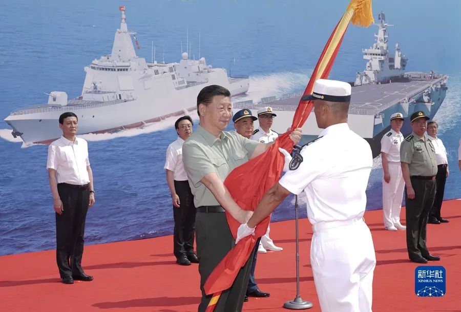 2021年4月23日,海軍三型主戰(zhàn)艦艇——長征18號艇、大連艦、海南艦在海南三亞某軍港集中交接入列。中共中央總書記、國家主席、中央軍委主席習(xí)近平出席交接入列活動并登上艦艇視察。這是習(xí)近平向長征18號艇授予軍旗、命名證書。